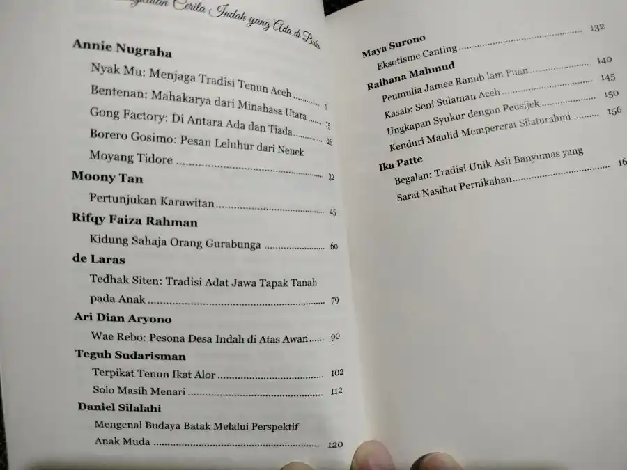 Saat ini saya baru membaca separuh buku, yang meliput berbagai rangkaian cerita indah tentang budaya Nusantara. Mulai dari tenun Aceh, Bentenan, Gong Factory, Pertunjukan Karawitan, Pesona Desa Wae Rebo, dan lain-lain.