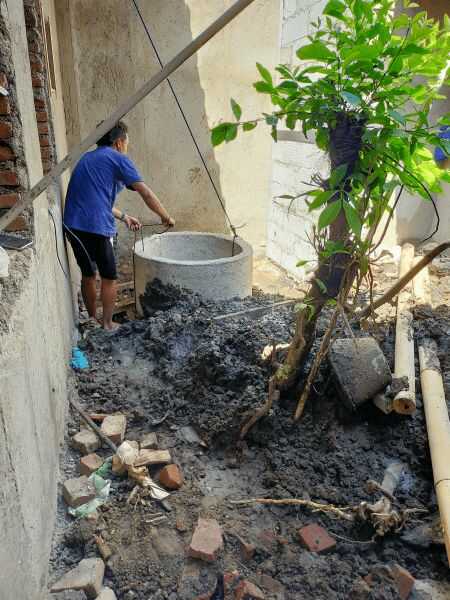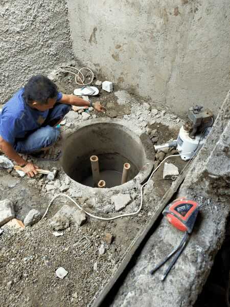 - Bila air tanah tinggi, sedot dulu air dengan pompa, kemudian lubangi dasar sumur dengan cerucuk bambu.