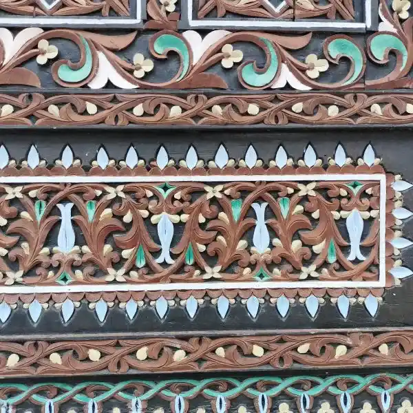 Pertama kali melihat masjid ini memang indah, seluruh dindingnya berukiran kayu dengan motif sulur-suluran dan bunga/flora, khas ornamen bangunan tradisional setempat. Dinding berwarna kecoklatan dan sentuhan warna-warni pada ornamen, merah, hijau, kuning, putih.