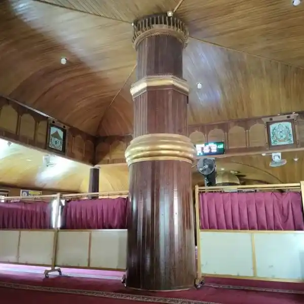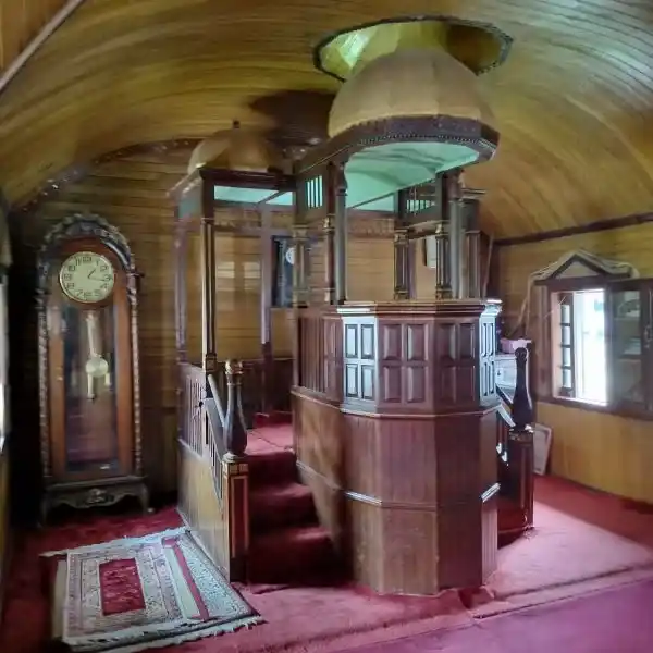 Seluruh dinding dalam dilapisi kayu yang terawat baik dan ada ornamen kaca yang berhias lafaz Allah.