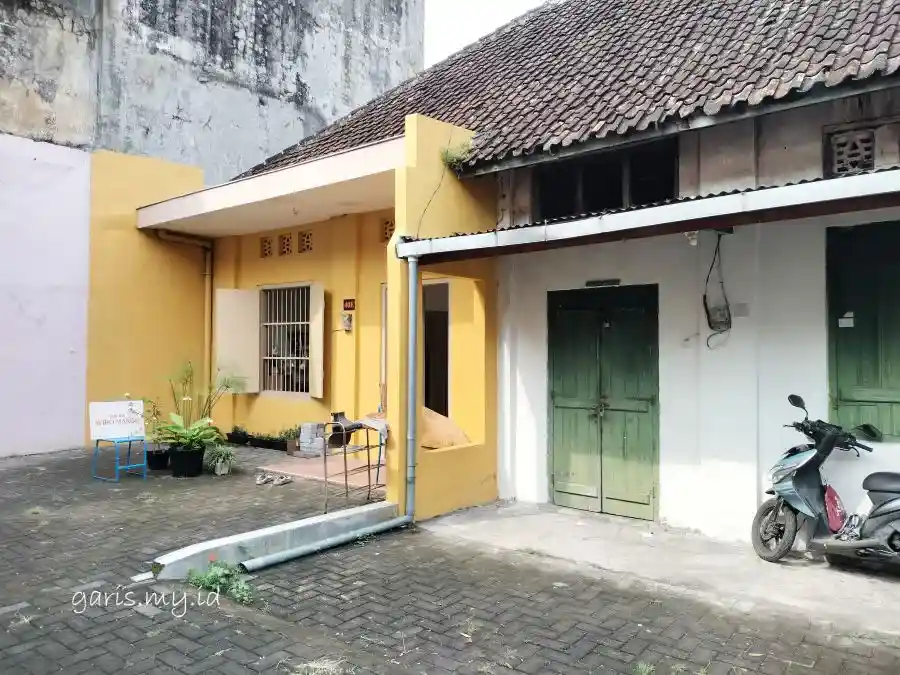 Sesampainya saya di sana, Omah Wiromargo terletak di ujung sebuah bangunan yang mirip rumah panjang. Ada lima pintu, mungkin dulunya rumah deret terdiri dari lima rumah dengan halaman dilapis con-block.