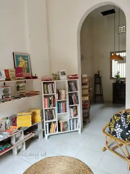 Di sebelahnya ruangan di balik jendela kayu, ruang baca berjajar mengelilingi dinding, rak-rak tersusun rapi buku dari berbagai genre. Ada buku-buku desain, setumpuk buku arsitektur, novel, buku cerita anak. Di lantai terbentang dua lembar karpet dan di depan rak kursi rotan beralaskan bantal duduk.